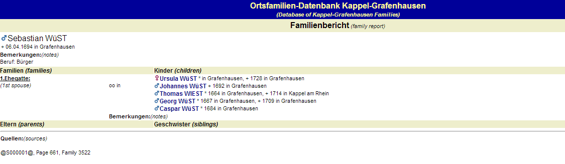 | name: Anna Maria Wuestin gender: Female baptism/christening date: Oct 1691 baptism/christening place: KATHOLISCH,GRAFENHAUSEN,FREIBURG,BADEN father's name: Hanss Georg Wuestin mother's name: Veronica Weltin indexing project (batch) number: C95026-2 system origin: Germany-ODM source film number: 907202 |