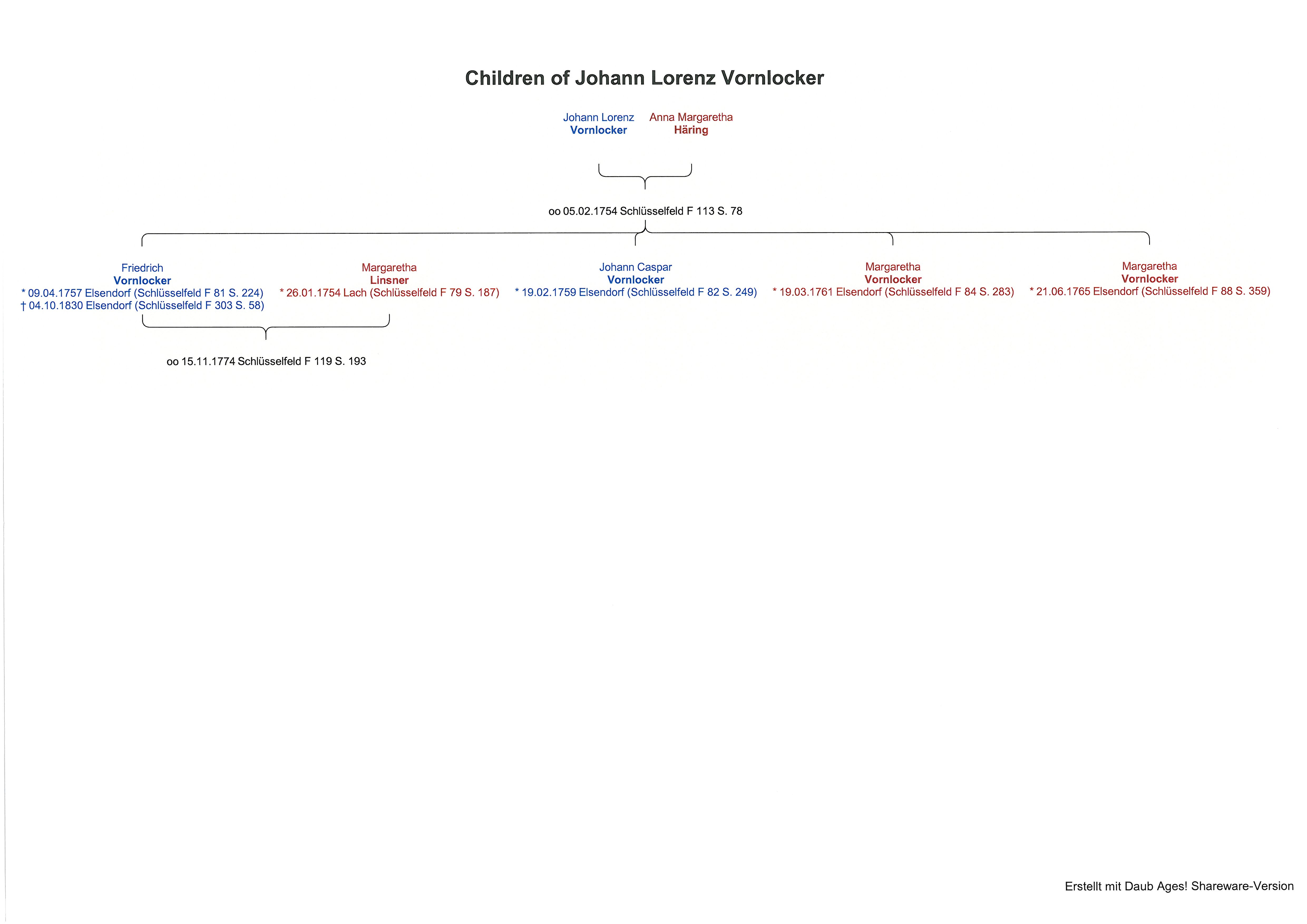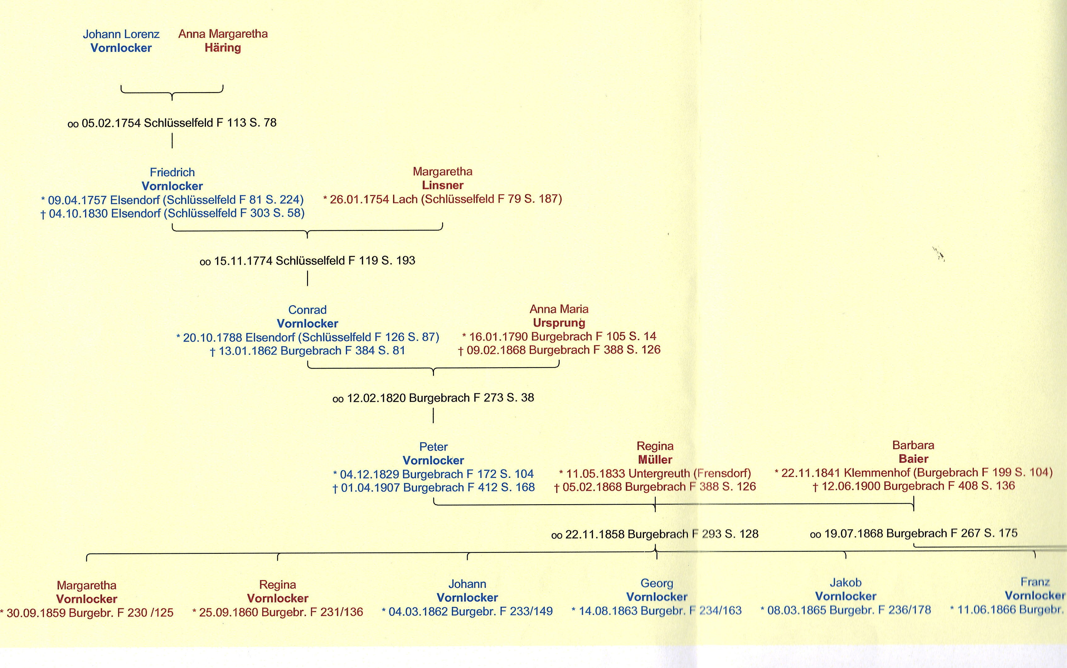 | MUELLER Regina (17) (1833 - 1868) | VORNLOCKER Margaretha (1859) VORNLOCKER Regina (1860) VORNLOCKER Johann (8) (1862 - 1896) VORNLOCKER George (1863 - 1922) VORNLOCKER Jakob (1865 - 1935) VORNLOCKER Franz (1866) VORNLOCKER Heinrich (1868 - 1868)