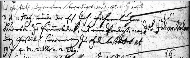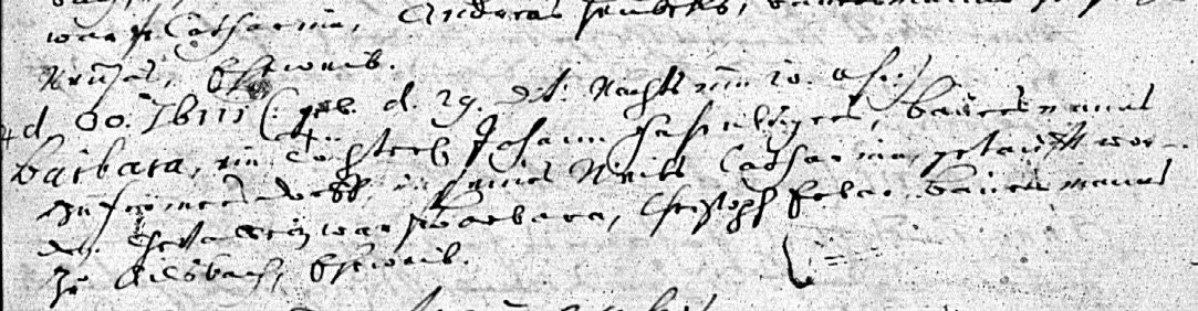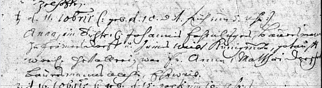| Eod. d. 14 Marti Hannß Fahrnluger Baur Zu Frömmersdorff Ehw. Catha.. ein Söhnlein getaufft, war geVatter Hannß Franck Baur … Ailsbach. Filius Johanns On the same day [as the previous record], 14 March Hans Fahrnluger, farmer in Frimmersdorf, and wife Catha[ina], baptized a little son. The sponsor was Hans Franck, farmer in Ailsbach. Son Johannes |