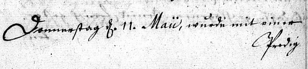 | gestorben 11.05.1769 (Lonnerstadt 185-13, 1769 S. 68-69 Nr. 13) als Bauer in Frimmersdorf Alter von 76 Jahren, 3 Monaten weniger 9 Tagen; Buried on 11 May 1769 with a sermon and other Christian rites: Johann Fahrnlucher, farmer in Frimmersdorf, who died from a strong flow [dysentery?] that started with vomiting which was followed by a high fever. He died on Tuesday, 9 May, at 9 o’clock in the morning. His age was 76 years, three months, less nine days. |