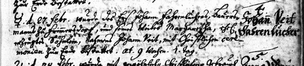 | 1731 Baptism Johann Veit Fahrenlucher Montag d. 24. December, früh um 8 Uhr ist dem Ers. Johann Fahrenlucher, und seinem Eheweib, Margaretha, ein Söhnl. gebohren, und am darauf folgend. Mittwoch, von dem Ers. Veit Thoma, Bauersmann zu Frimmersdorf, aus der Heil. Tauffe erh… und mit Zusagung des Vatters nahmen, Johann Veit, genennet worden. Born on Monday, 24 December 1731, at 8 o’clock in the morning, and baptized the following Wednesday: Johann Veit, son of the respectable Johann Fahrenlucher and his wife Margaretha. Sponsor: the respectable Veit Thoma, farmer in Frimmersdorf. |