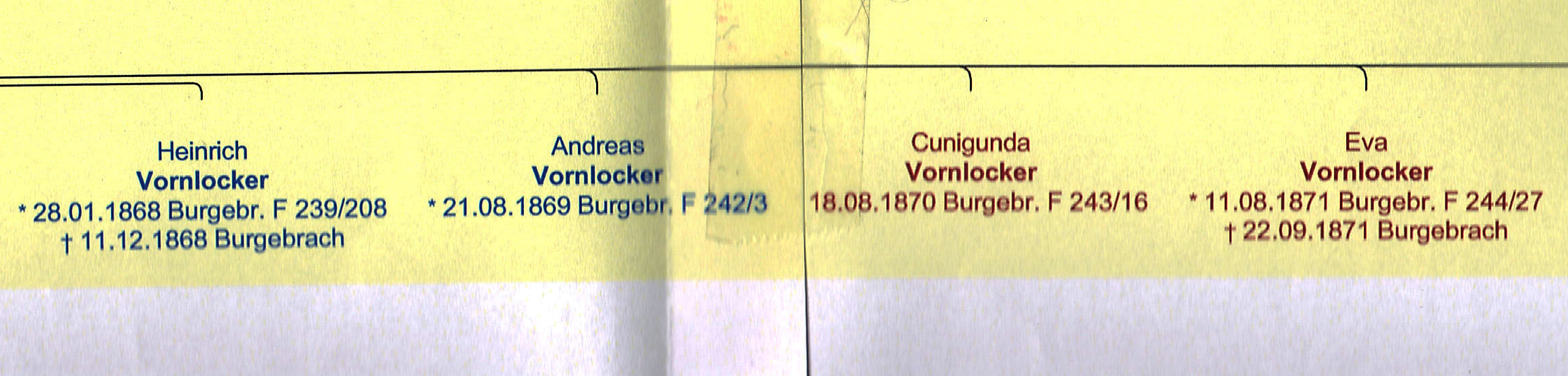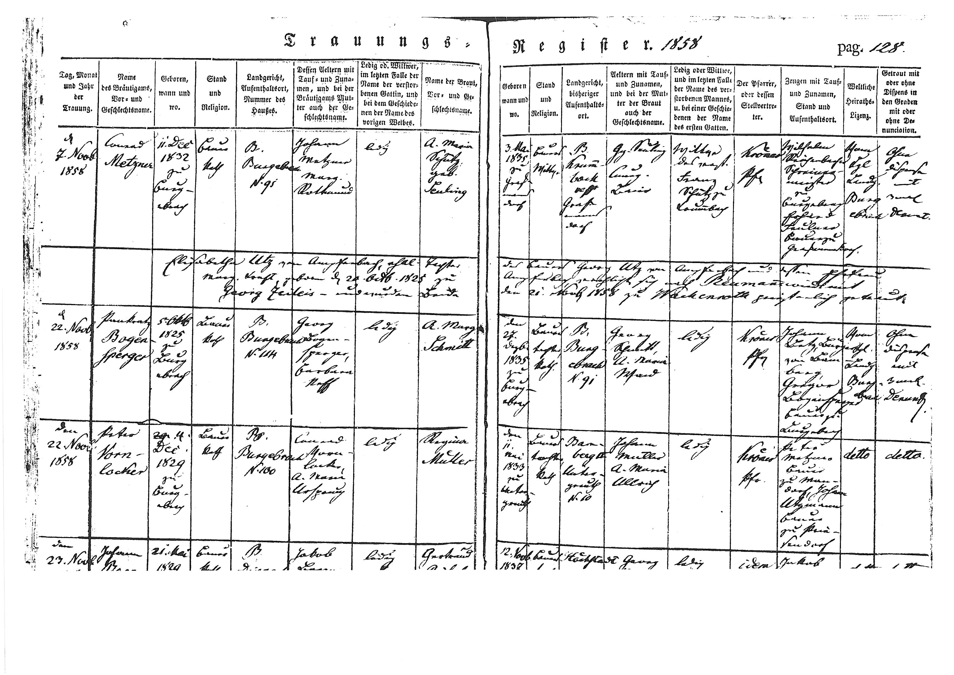 | Peter Vornlocker & Regina Mueller were married 22.11.1858 Burgebrach House 100 Groom Father - Conrad Vornlocker Groom Mother - Anna Maria Ursprung Bride Father - Johann Mueller Bride Mother - Annz Maria Ulrich |