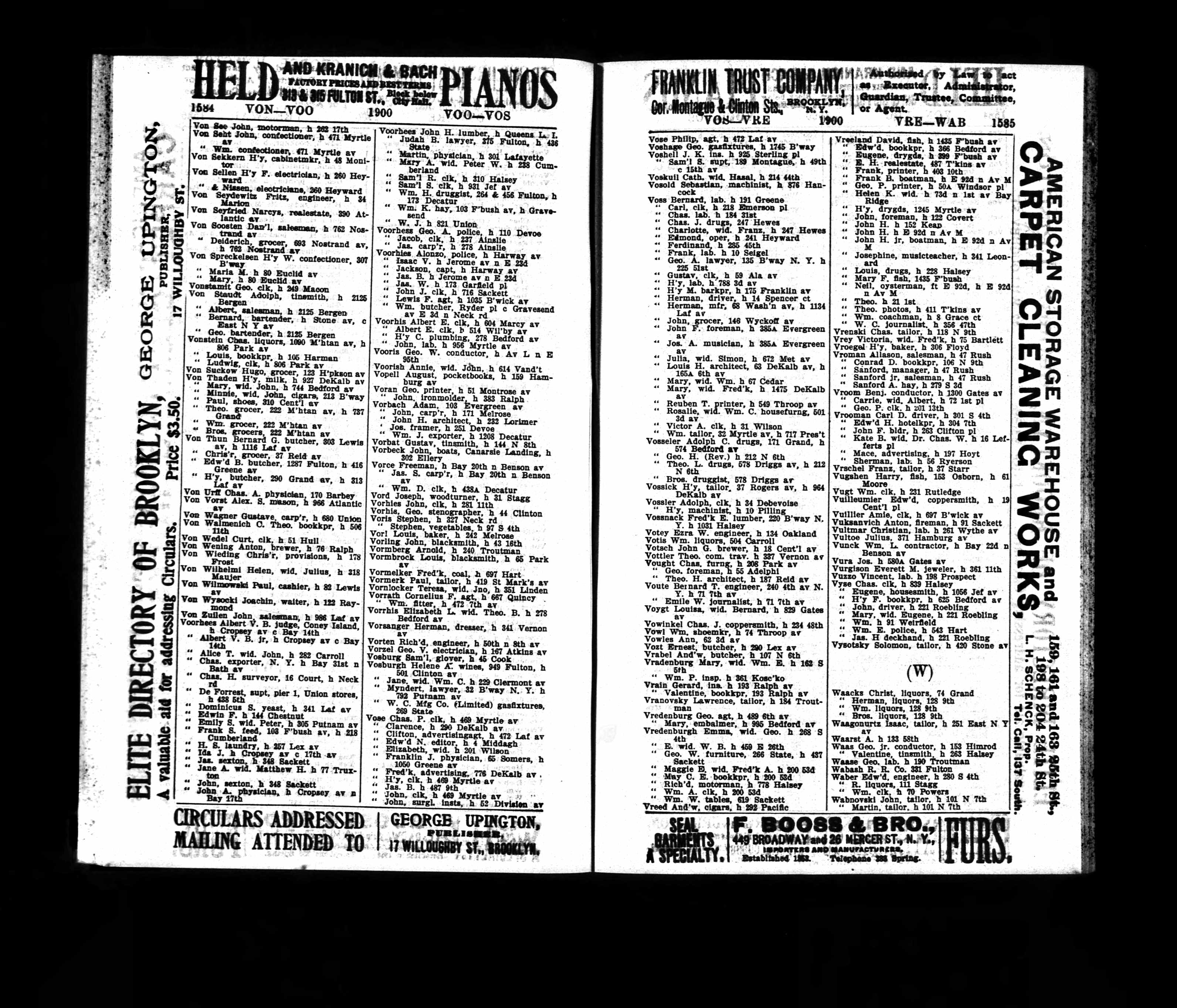 | Theresa Vornlocker Residence Year: 1898 Street Address: 196 Wyckoff av Residence Place: Brooklyn, New York Occupation: Liquors Spouse: John Vornlocker Publication Title: Brooklyn, New York, City Directory, 1898 |