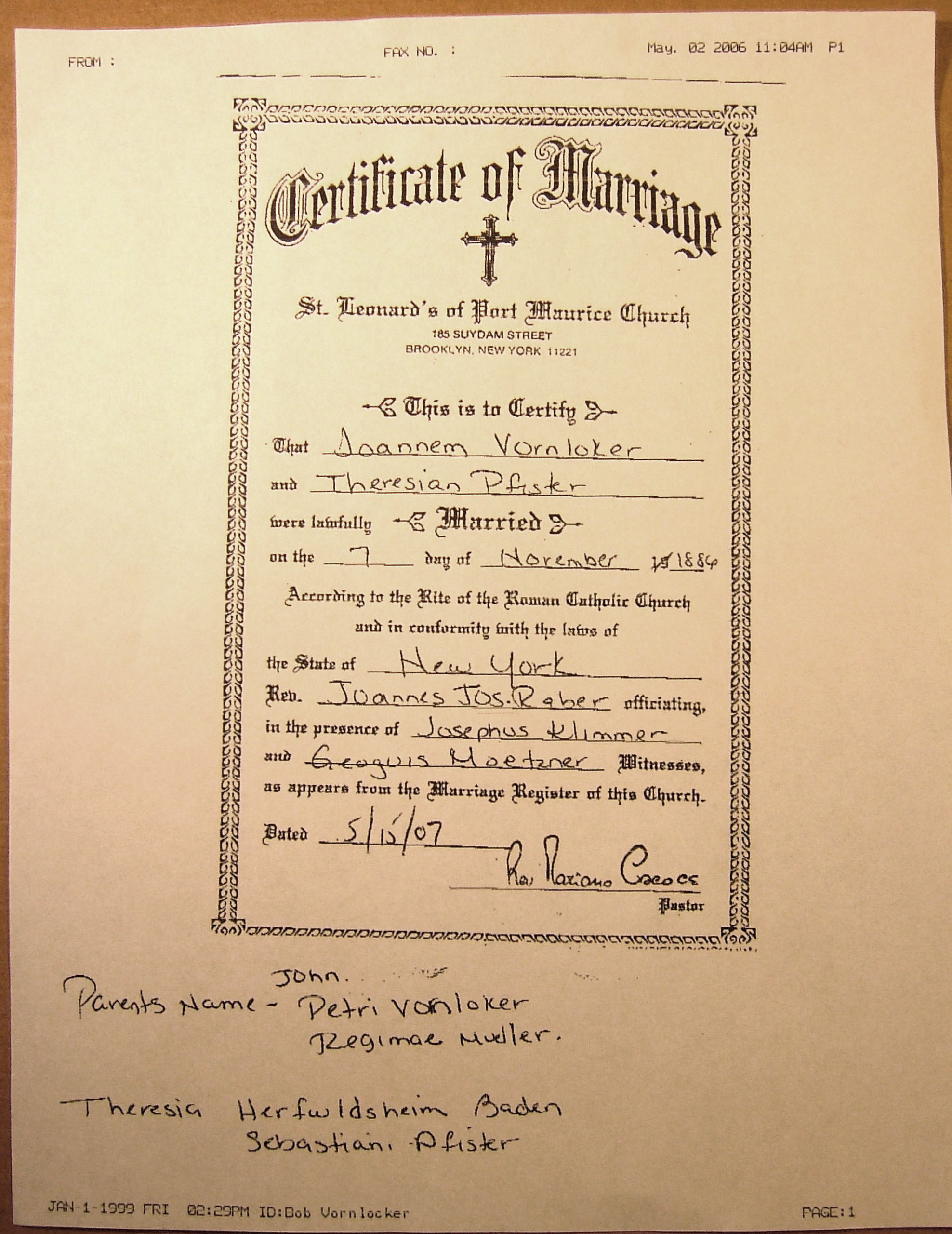 | St. Leonard's Book 1 Page 87 Entry 2 Date of Marriage: 7-Nov 1886 Groom: John Vornloker Place of origin: Burg Eberach Bavaria Father's Name: Peter Mother's Name: Regina Mueller Bride: Theresia Pfister Place of origin: Herrpoldsheim Baden Father: Sebastian Mother: No name in records Witness 1: Joseph Klimmer Witness 2: George Metzner Priest: John Joseph Raber |