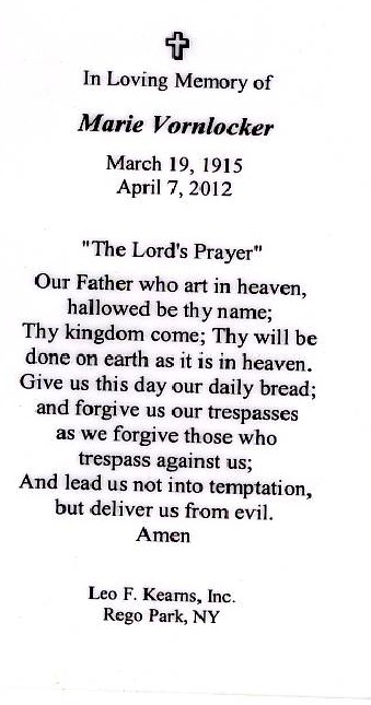 | MARIE VORNLOCKER Date of Interment: April 12, 2012 Unit: --- | Floor: --- Section: 48 | Row: R | Plot: --- | Grave: 125 |