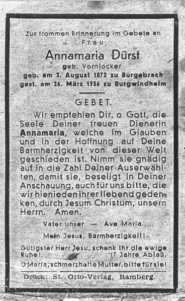 | Anna Maria Vornlocker was born in Burgebrach 02.08.1872 Father - Peter Vornlocker Mother - Barbara Baier |