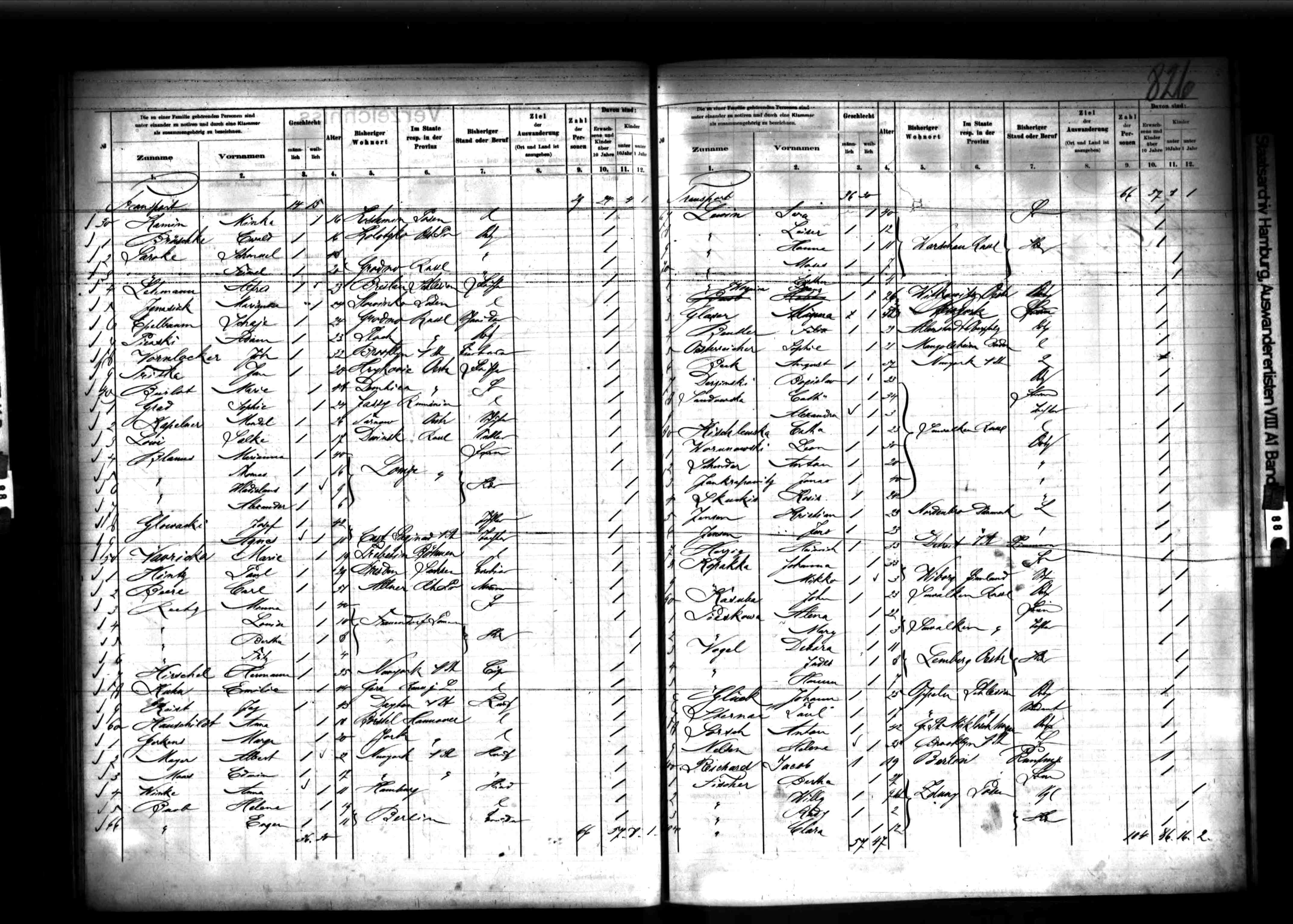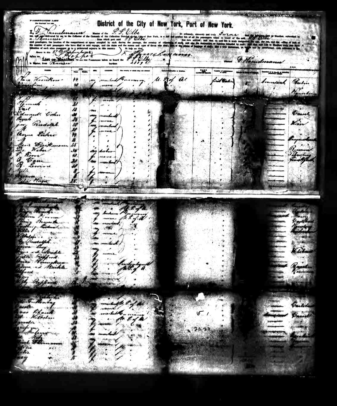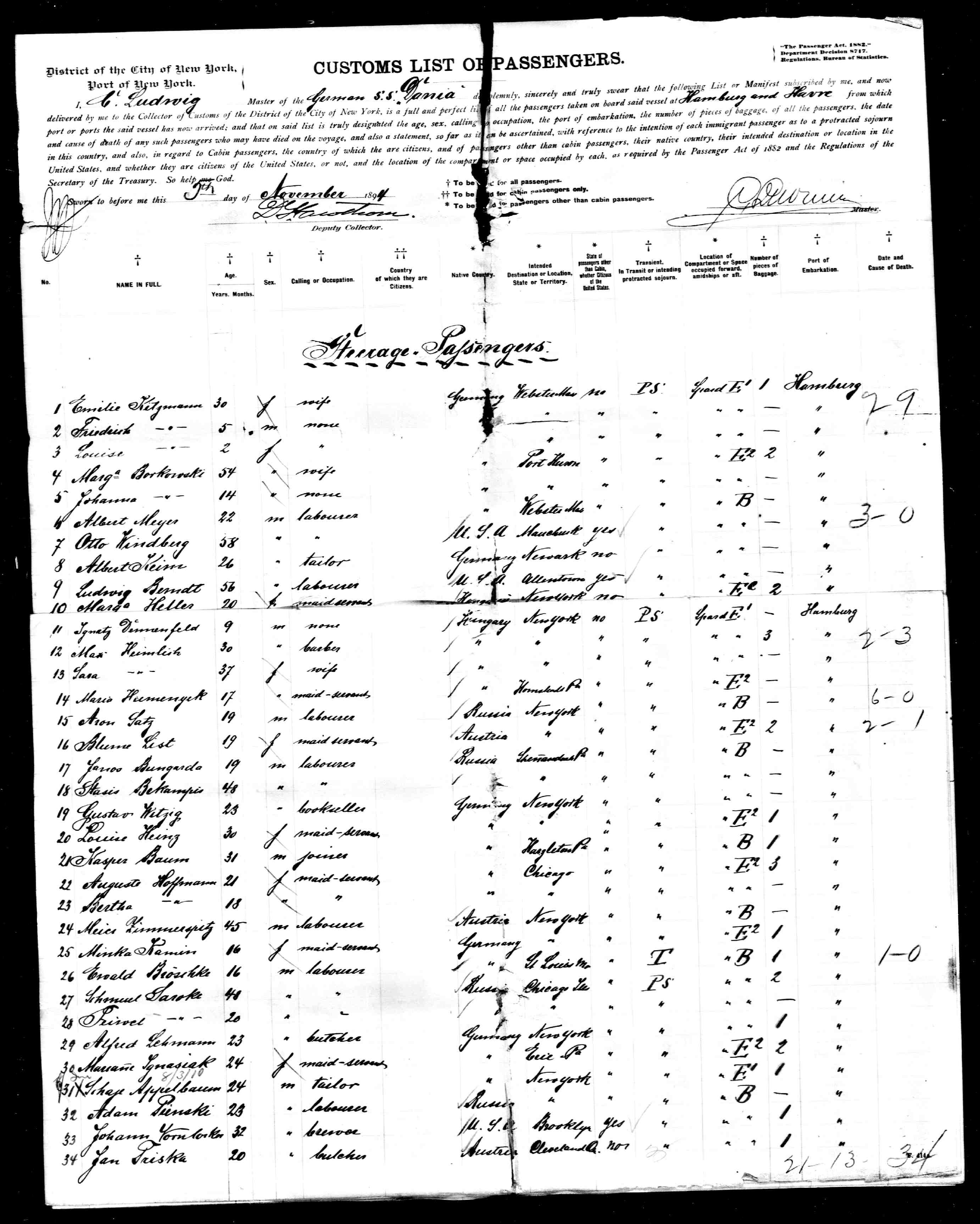 | Joh Vornlocker Departure Date: 21 Okt 1894 (21 Oct 1894) Estimated birth year: abt 1862 Age Year: 32 Gender: männlich (Male) Family: Household members Residence: Brooklyn, USA Occupation: Bierbrauer Ship Name: Dania Captain: Reessing; Ludwig Shipping Line: Hamburg-Amerika Linie (Hamburg-Amerikanische Packetfahrt-Actien-Gesellschaft) Ship Type: Dampfschiff Accommodation: Zwischendeck Ship Flag: Deutschland (Germany) Port of Departure: Hamburg Port of Arrival: New York Castle Gardens First Name: Johann Last Name: Vornlacker Ethnicity: USA Last Place of Residence: Date of Arrival: Nov 05, 1894 Age at Arrival: 32y Gender: M Marital Status: Ship of Travel: Dania Port of Departure: Hamburg via Havre Manifest Line Number: 0033 |