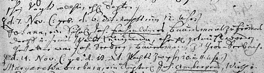 | John christened 07/11/1725 (Lonnerstadt 185-2, 1725 p. 296), the son of farmer John Fahrnluger of Frömmersdorf and Kunigunda [the Catholic wedding this Child was sent as a starting date]. 1725 Baptism Johann Fahrnluger Freitag den 7. Nov (geb. d. 6. dit. Nachts um 12 Uhr) Johann, ein Söhnl. Joh. Fahrnlugers, Bauersmanns zu Frömmersdorff u. seines Weibs Kunigunda, christl. getauft worden. Gevatter war Joh. Seeberg, Bauersmann zu Gros-Seebach Born on 6 November 1725 at 12 o’clock at night, and baptized on Friday, 7 November: Johann, son of Johann Fahrnluger, farmer in Frömmersdorf, and his wife Kunigunde. Sponsor: Johann Seeberg, farmer in Groß Seebach. |
