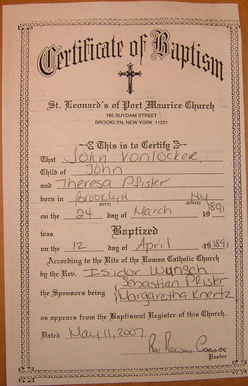 | St. Leonard's Baptism Records Index Vonlocker John 1891 24-Mar 1891 4 14 137 V542 |