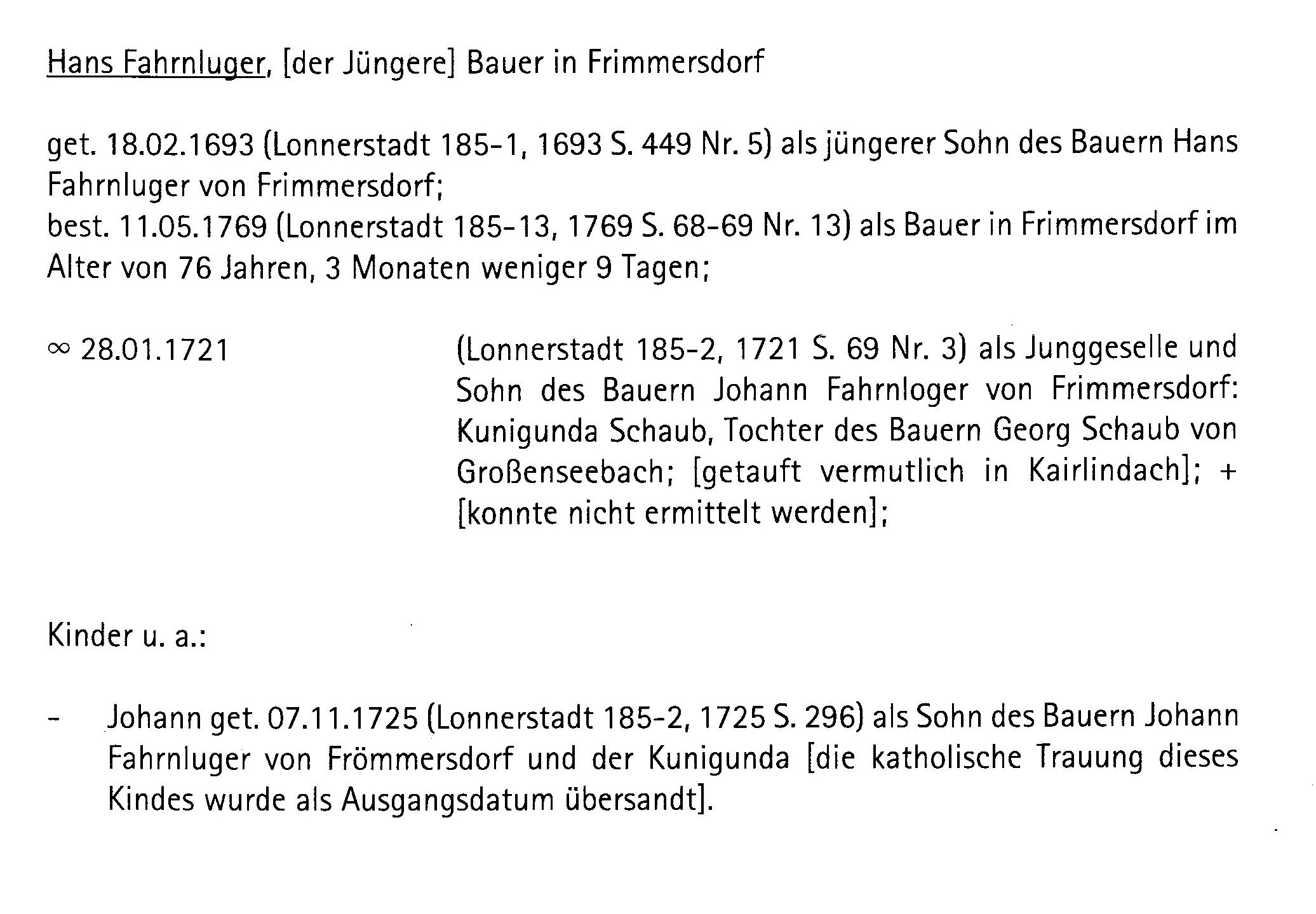 | Hans Fahrnluger [the Younger] Farmer of Frimmersdorf christened 18/02/1693 (Lonnerstadt 185-1, 1693 p. 449 n. 5), as a younger son of the farmer Hans Fahrnluger of Frimmersdorf; died 11/05/1769 (Lonnerstadt 185-13, 1769 68-69 No. 13) as a farmer in Frimmersdorf Age of 76 years, 3 months, 9 days less; married 28/01/1721 (Lonnerstadt 185-2, 1721, p. 69 No. 3) as a bachelor and Son of the farmer Johann Fahrnloger of Frimmersdorf: Kunigunda Schaub, daughter of farmer George Schaub of Großenseebach, [probably baptized in Kairlindach] + [Could not] be determined; Children including: - John christened 07/11/1725 (Lonnerstadt 185-2, 1725 p. 296), the son of farmer John Fahrnluger of Frömmersdorf and Kunigunda [the Catholic wedding this Child was sent as a starting date]. |