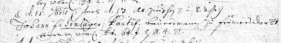 | Johannes (Hans) Fahrnluger, Bauer in Frimmersdorfgetauft 12.01.1657 (Lonnerstadt 185-1, 1657 S. 306 Nr. 72) als Sohn des Blasius Fahrenluger und der Anna; bestattet 15.09.1721 (Lonnerstadt 185-2, 1721 S. 445 Nr. 32) als Bauer in Frimmersdorf im Alter von 64 Jahren, 8 Monaten und 4Tagen; verheiratet 31.01.1687 (Lonnerstadt 185-1, 1687 S. 653 Nr. 3) als angehender Bauer in Frimmersdorf und Sohn des Bauern Blasius Forluck in Frimmersdorf: Catharina Kayser, Tochter des Büttners und Bierbrauers Hans Keyser von Frimmersdorf; getauft 26.07.1659 (Lonnerstadt 185-1, 1659 S. Nr. 122) als Tochter des Bierbrauers Hans Kaiser und der Anna, die Eltern sind der katholischen Religion zugetan [laut Randvermerk]; gestorben 14.09.1741 (Lonnerstadt 185-9, 1741 S. 39 Nr. 27) als Witwe des Bauern Hans Fahrenluchers im Alter von 82 Jahren, 2 Monaten, 2 Wochen und 3 Tagen; Kinder u. a.: - Johannes getauft 04.03.1689 (Lonnerstadt 185-1, 1689 S. 426 Nr. 13); zwei Ehen im Jahr 1718 und 1719 [nach weiteren Daten wurde nicht gesucht] - Johannes getauft 18.02.1693 (Lonnerstadt 185-1, 1693 S. 449 Nr. 5); [weitere Lebensdaten siehe auf einem eigenen Blatt). Johannes (Hans) Fahrnluger, farmer in Frimmersdorf christened 12/01/1657 (Lonnerstadt 185-1, 1657, p. 306 n. 72), the son of Blasius Fahrenluger and Anna; buried 15/09/1721 (Lonnerstadt 185-2, 1721 p. 445 No. 32) as a farmer in Frimmersdorf the age of 64 years, 8 months and 4days; married 31/01/1687 (Lonnerstadt 185-1, 1687 p. 653 n. 3) as prospective Farmer and son of peasants in Frimmersdorf Blasius Forluck in Frimmersdorf and Anna,Parents are fond of the Catholic religion [loud Marginal note : Catharina Kayser, daughter of cooper and brewer Hans Keyser of Frimmersdorf; baptized 26/07/1659 (Lonnerstadt 185-1, 1659 S. No. 122) as Daughter of the brewer Hans Kaiser, died 14/09/1741 (Lonnerstadt 185-9, 1741P. 39 No. 27) as the widow of farmer Hans Fahrenluchers in Age of 82 years, 2 months, 2 weeks and 3 days; Children including: - John christened 04/03/1689 (Lonnerstadt 185-1, 1689 p. 426 No. 13), two marriages in 1718 and 1719 [more information was not sought] - John christened 18/02/1693 (Lonnerstadt 185-1, 1693 p. 449 5) |