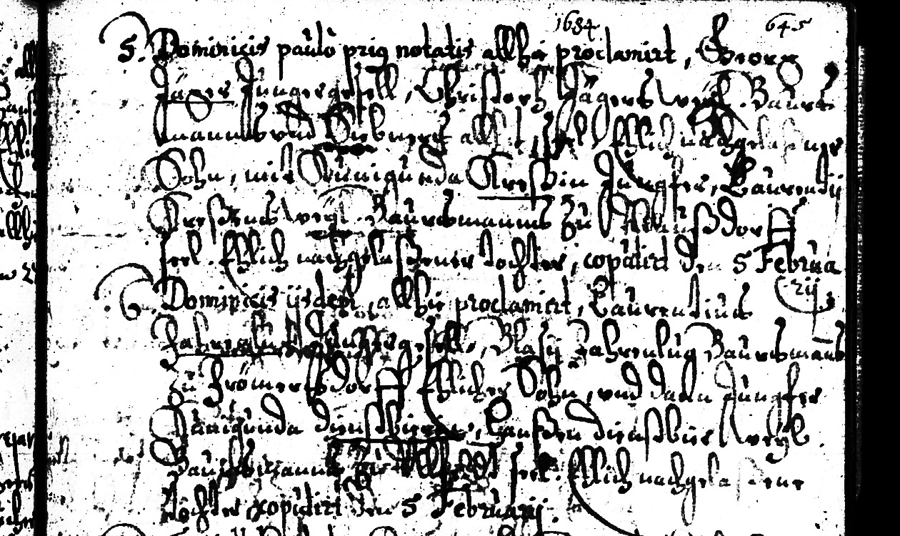 | 1684 Dominius iisdem, allhir proclamirt, Laurentius Fahrenlug Jungergeselle, Blasii Fahrenlug Baursmanns zu Frömersdorff Ehlicher Sohn, und dann Jungfer Kunigunda Dienstbierin, Hanßen Dienstbier weÿl. Baursmanns zu Uelfeldt seel. Ehlich nachgelaßene Tochter, copulirt den 5 Februarii. Proclaimed on the same Sunday [as the entry above] and married on 5 February: Lorenz Fahrenlug, unmarried young man, legitimate son of Blasius Fahrenlug, farmer in Frimmersdorf, with the young maiden Kunigunda Dienstbier, legitimate daughter of the deceased Hans Dienstbier, formerly farmer in Uehlfeld. |